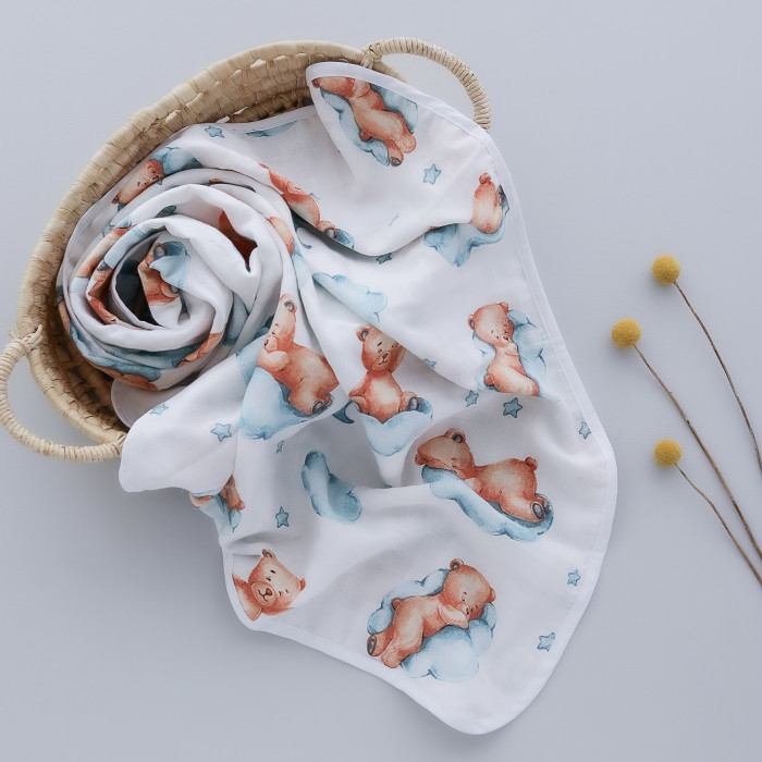 Мусліновий плед 4 шари Ведмедик на хмаринці Бірюзовий 100/80