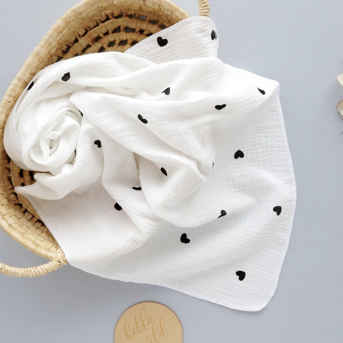 Муслінова пелюшка жатка 2 шари Сердечка чорні на білому 90/65