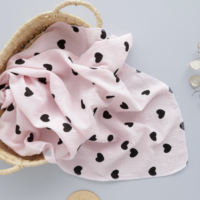 Муслінова пелюшка жатка 2 шари Сердечка чорні на рожевому 90/65