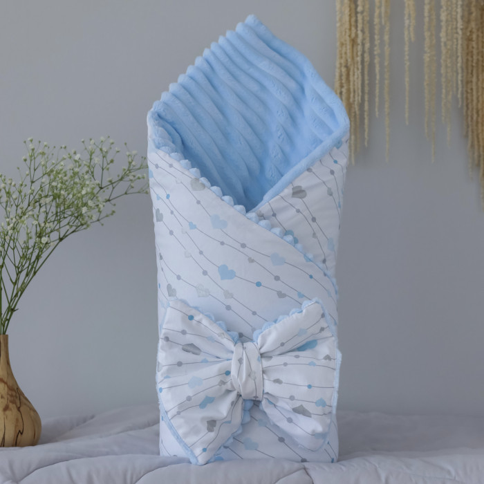 Плед зі зʼємним утепленням та бантом -резинкою Сердечка Блакитний -Сірий (гліттер) /Блакитний плюш 90/80