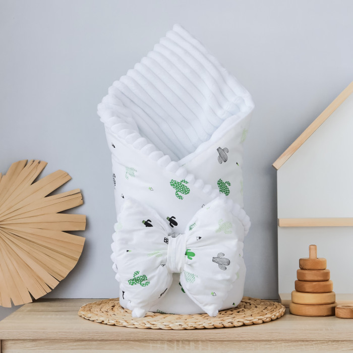 Плед зі з‘ємним утеплювачем та бантом-резинкою Кактуси / Білий плюш 90/80