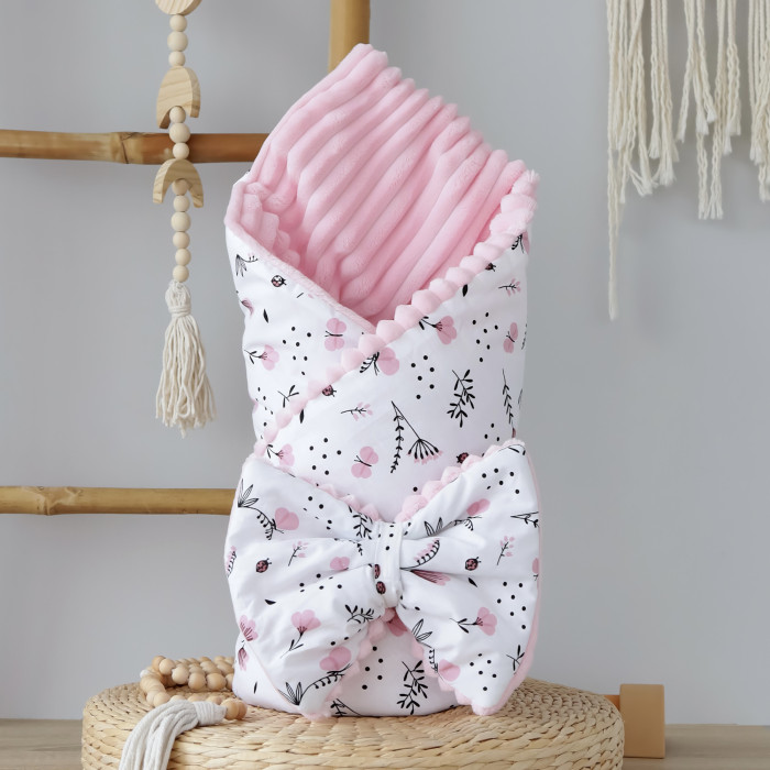 Плед зі з‘ємним утеплювачем та бантом-резинкою Квіточки Рожевий / Рожевий плюш 90/80