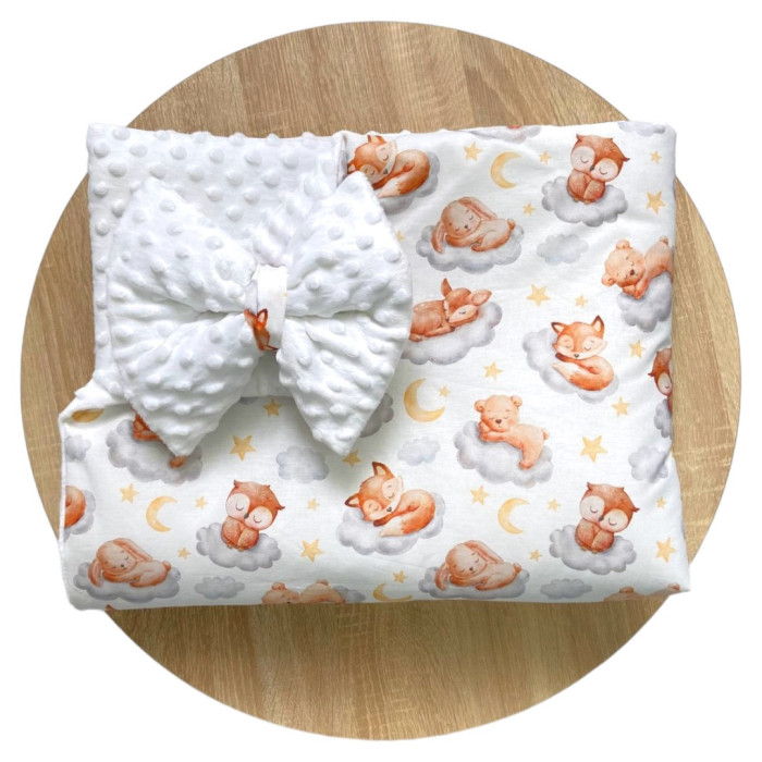 Плед зі з‘ємним утеплювачем та бантом-резинкою Лисички на хмаринці /Білий плюш пупиришка 90/80