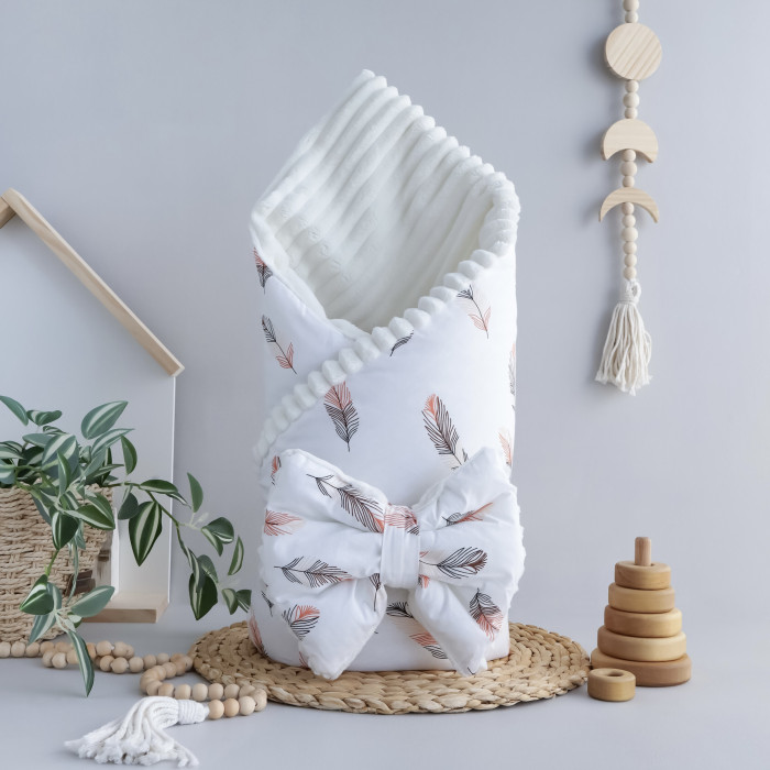 Плед зі з‘ємним утеплювачем та бантом-резинкою Пір‘їнки Коралові /Молочний плюш 90/80