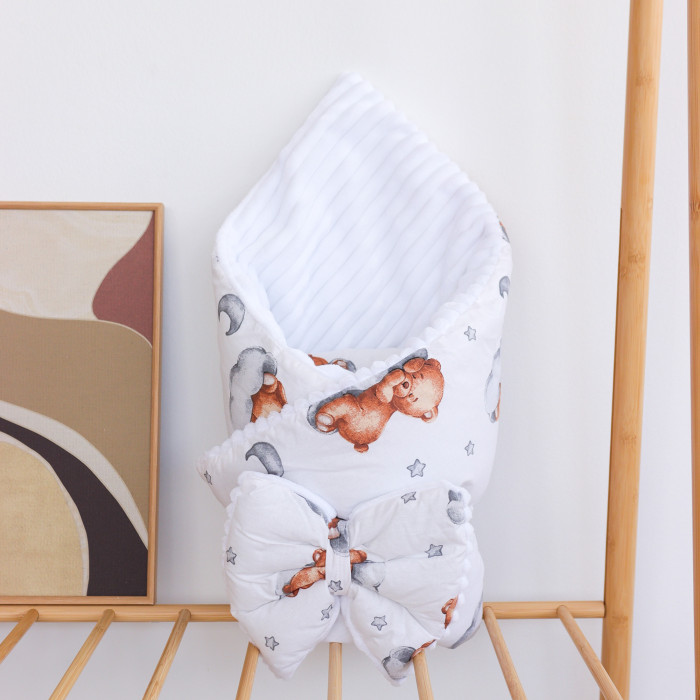 Плед зі з‘ємним утеплювачем та бантом-резинкою Ведмедик Коричневий на хмаринці/ Білий плюш 90/80