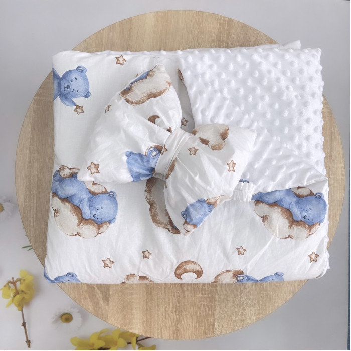 Плед зі з‘ємним утеплювачем та бантом-резинкою Ведмедик на хмаринці Блакитний/ Білий плюш пупиришка 90/80