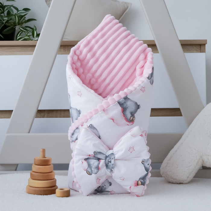 Плед зі з‘ємним утеплювачем та бантом-резинкою Ведмедик на Рожевій хмаринці/ Рожевий плюш 90/80