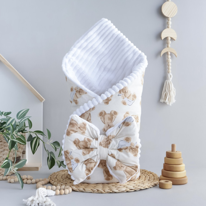 Плед зі з‘ємним утеплювачем та бантом-резинкою Ведмедики з хусточкою Бежевий/ Білий плюш 90/80