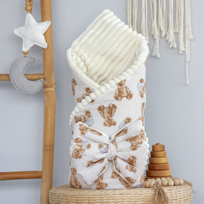 Плед зі з‘ємним утеплювачем та бантом-резинкою Ведмедики з хусточкою Бежевий/ Молочний плюш 90/80