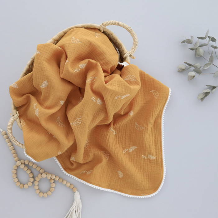 Мусліновий плед жатка 2 шари Листики на Помаранчевому 130/100