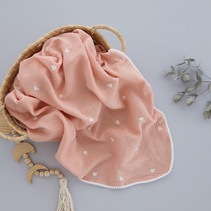 Мусліновий плед жатка 2 шари Сердечка Білі на Рожевому 130/100