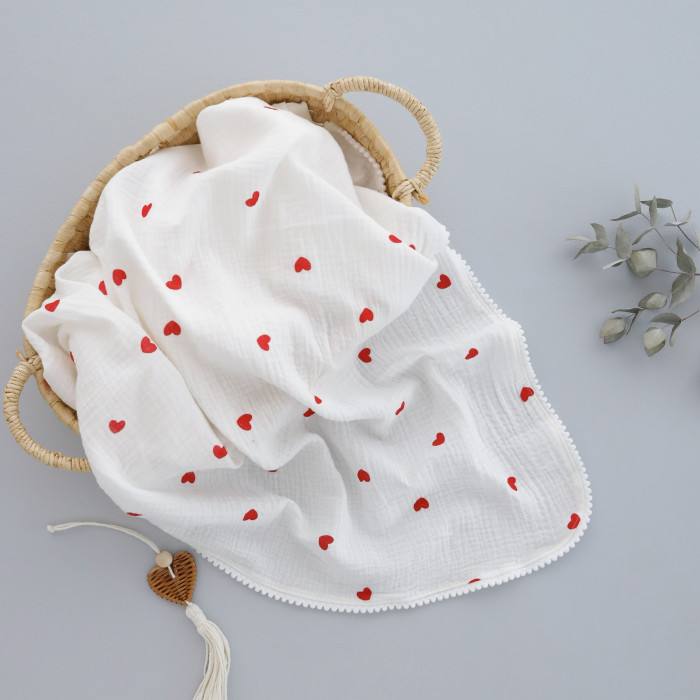 Мусліновий плед жатка 2 шари Сердечка червоні 130/100