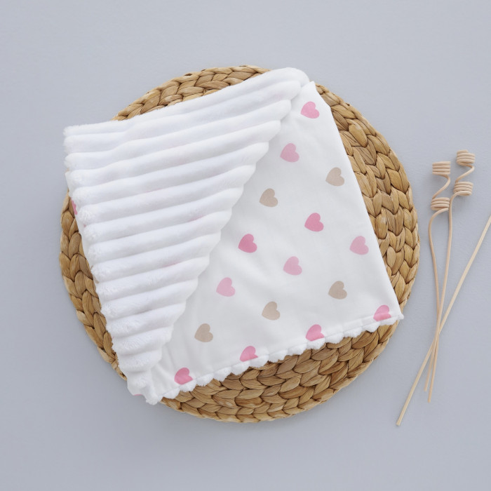 Плед плюш, без утеплення Сердечка Рожевий-Бежевий /Білий плюш 100/80