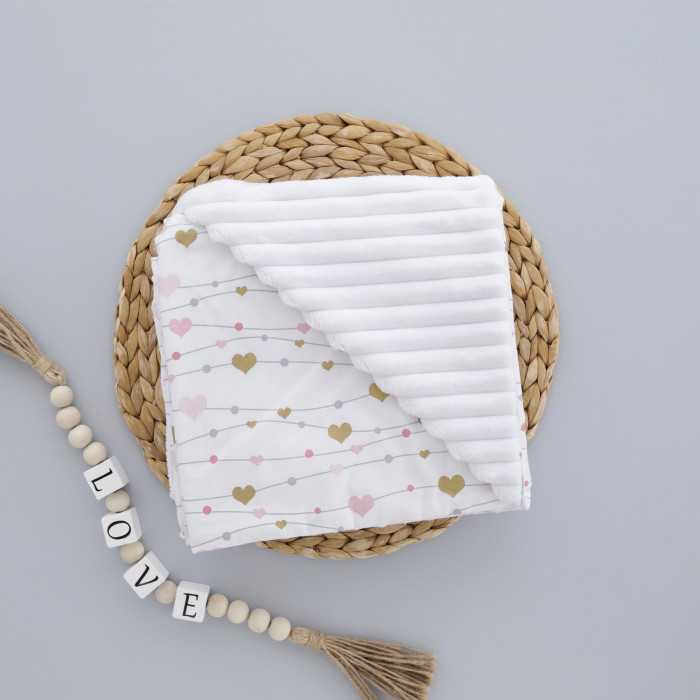Плед плюш, без утеплення Сердечка Рожевий -Золото (гліттер) /Білий плюш 100/80