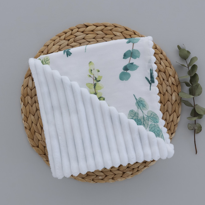Плед плюш, без утеплення Листики Зелений/ Білий плюш 100/80