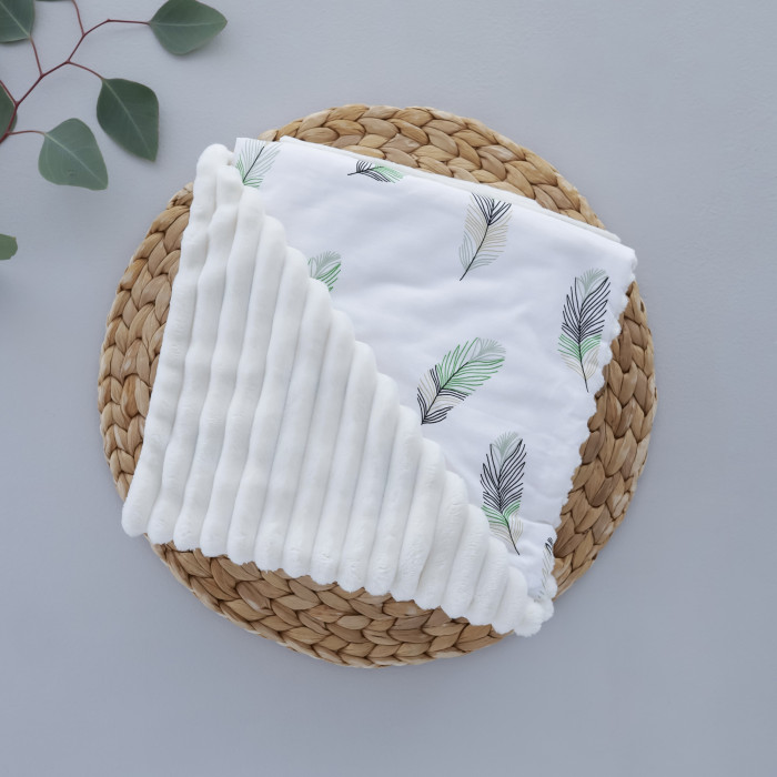 Плед плюш, без утеплення Пір’їнки Зелений / Молочний плюш 100/80