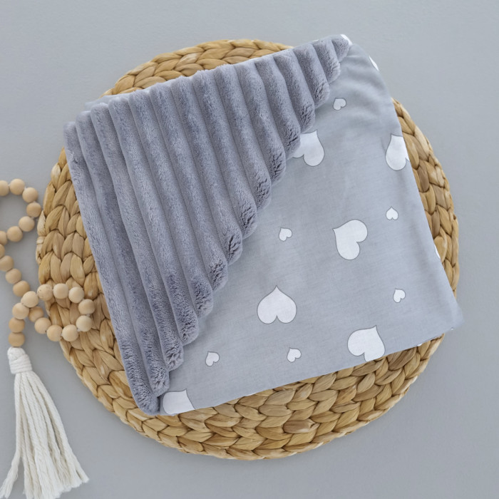Плед плюш, без утеплення Сердечка білі на сірому /Сірий плюш 100/80