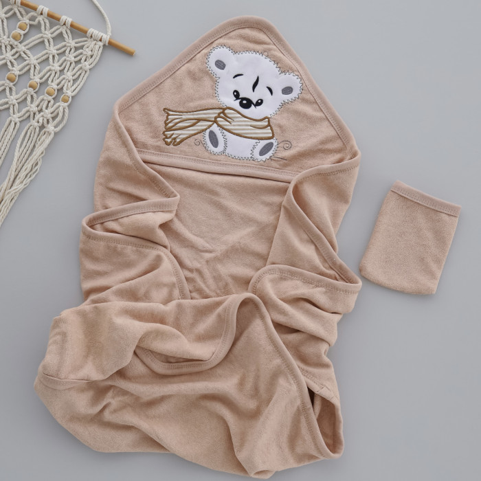 Дитячий рушник з кутиком махровий Ведмедик з шарфом Коричневий 90/85