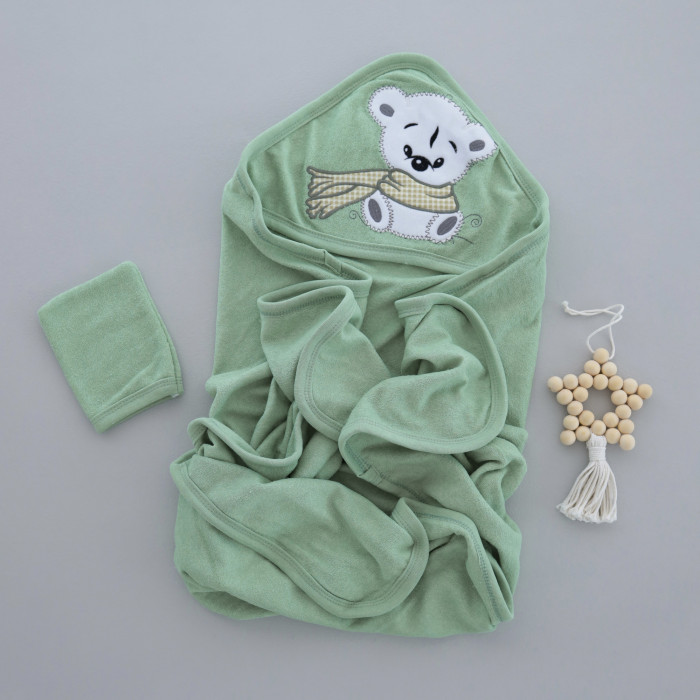 Дитячий рушник з кутиком махровий Ведмедик з шарфом Оливковий 90/85