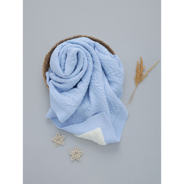 Плед вʼязаний утеплений (Natural Wool) Блакитний косичка широка 90/80