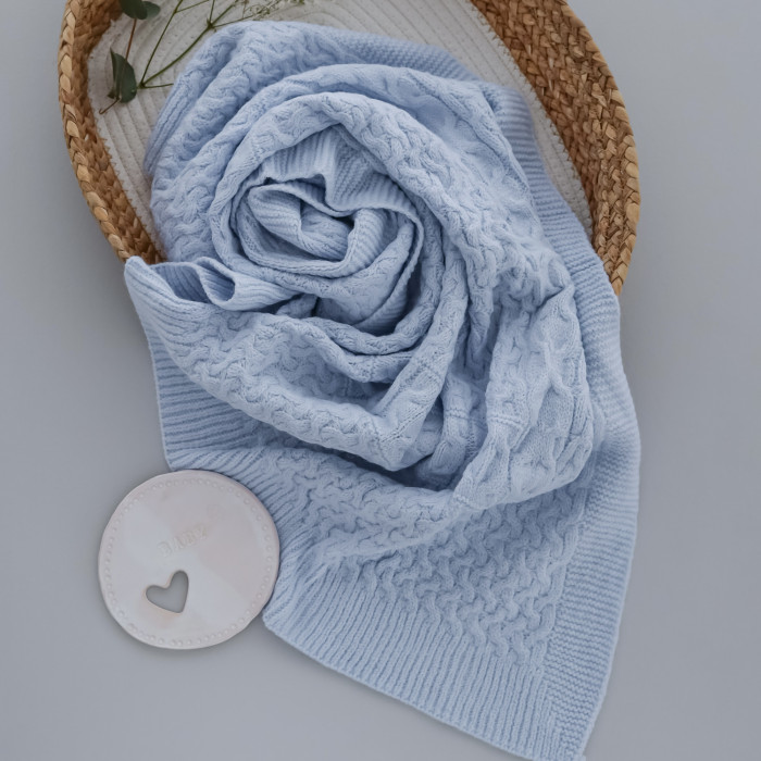 Вʼязаний плед демісезонний Блакитний плетіння (Natural Wool) 90/75