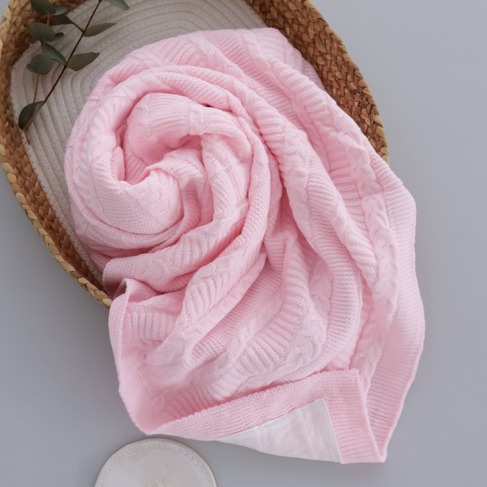 Вʼязаний плед демісезонний з підкладкою Рожевий косичка 90/80